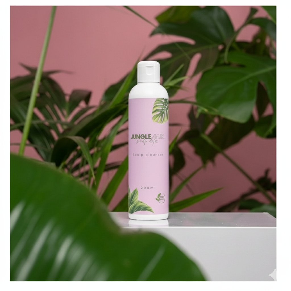 Umyte vlasy klasicky šampónom (ideálne z línie Jungle Hair). Do pohára s približne 200 ml vody zmiešajte 3 viečka Scalp Cleansera a pomaly zmes nalejte na pokožku hlavy. Nechajte pôsobiť 3–5 minút, potom dôkladne opláchnite. Na záver aplikujte kondicionér alebo masku Jungle Hair podľa potreby.