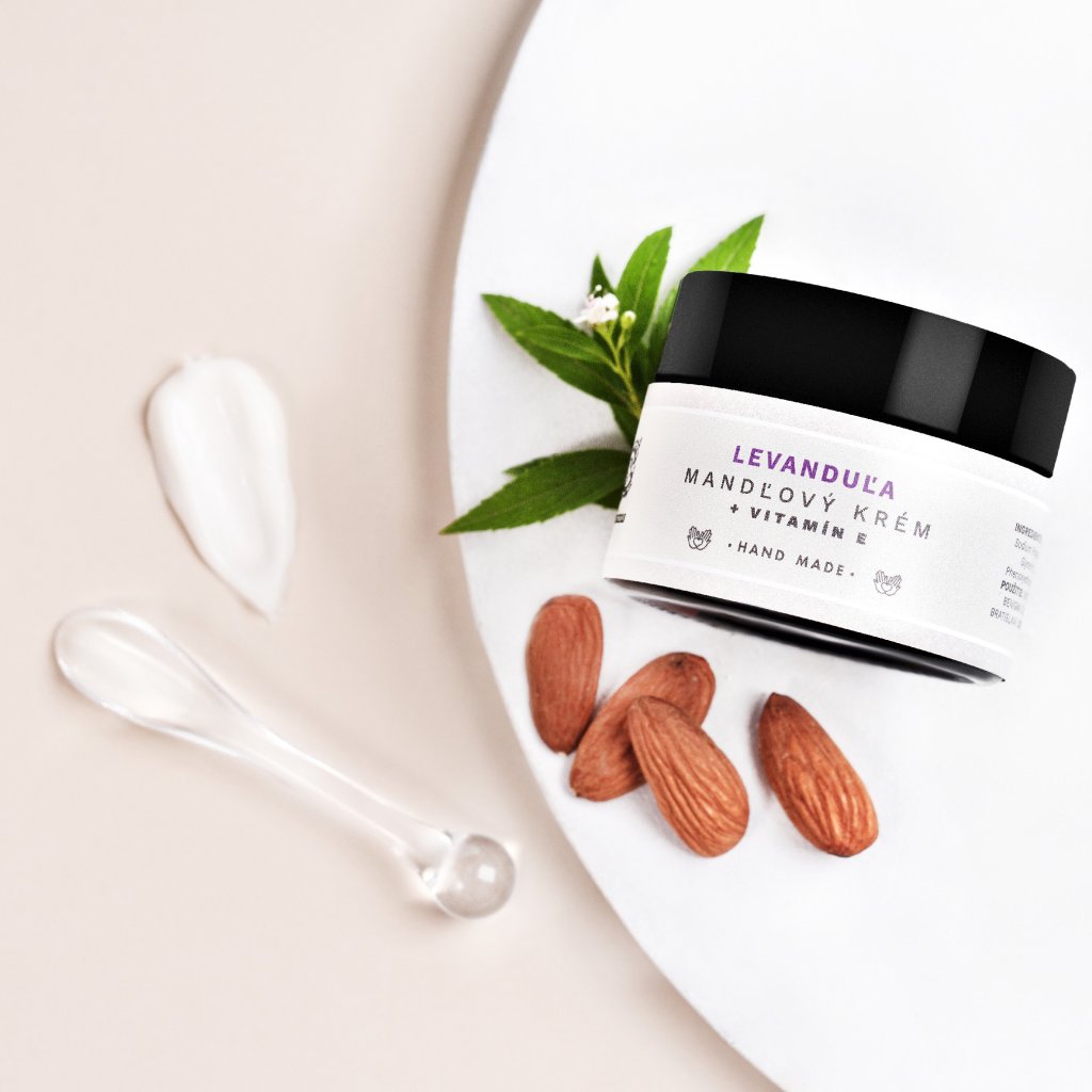 💜 Jemný mandľový krém s levanduľou – pleť na prvom mieste. Ľahká, nemastná emulzia s vysokým podielom mandľového a arganového oleja, obohatená o vitamín E, panthenol a aloe, okamžite zjemňuje a zvláčňuje unavenú pleť. Glycerín viaže vodu a znižuje pocit pnutia, aby bola pokožka príjemne pružná a komfortná. Jemné bylinkové tóny levandule navodzujú upokojujúci rituál, ideálne najmä večer. Krém sa rýchlo vstrebáva bez mastného filmu a sekundárne spoľahlivo zvláčni aj ruky a veľmi suché miesta (lakte, kolená, päty). Vhodný na celoročné, každodenné použitie.