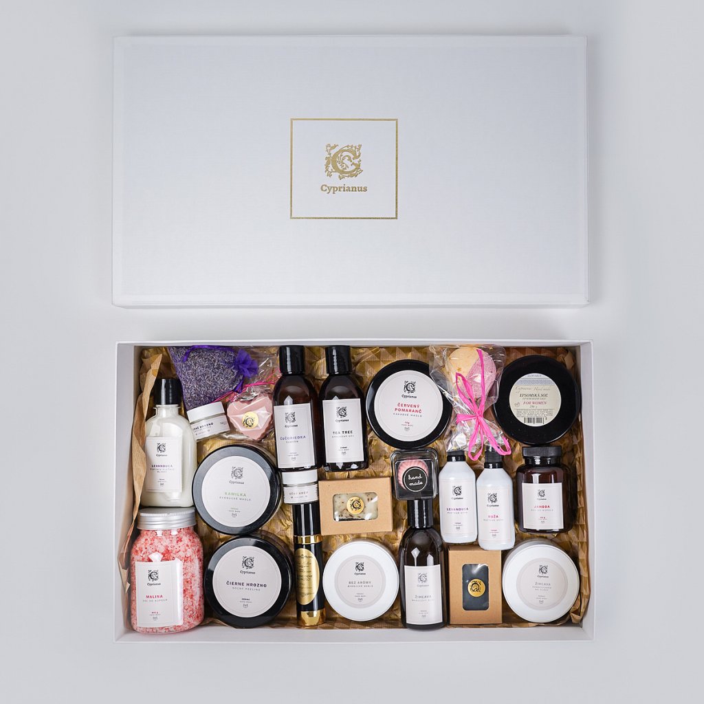 Obdarujte výnimočne XL balenie je ideálna voľba na zabalenie Vami zakúpených produktov pre Vaších najbližších. Produkty vložíme do bielej darčekovej kazety so zlatým logom Cyprianus.