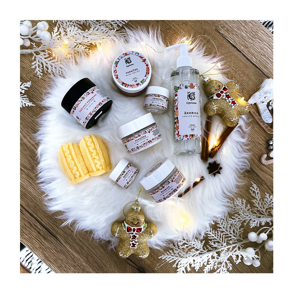 Vôňa produktov - perníček, škorica a červený pomaranč Kazeta obsahuje aj dopis od Ježiška s obsahom a použitím: "1.Glycerínové mydlo s kozím mliekom perníček – ma priaznivé účinky na pokožku, ktorú nevysušuje a dodáva jej pružnosť a vláčnosť. 2.Tekuté mydlo škorica má antibakteriálny účinok, neupcháva póry a pomáha pri problémoch s akné zároveň je bohaté na vitamíny. 3. Soľný peeling perníček používaj raz za týždeň, účinne odstraňuje odumreté kožné bunky, zlepšuje prekrvenie pokožky a tým aj celkový vzhľad kože. Je obohatený o Vitamín E. 4.-5.Bambucké maslo veľké používaj po sprchovaní na cele telo alebo aj na tvár, ma vysoké protizápalové a antibakteriálne účinky s vysokým obsahom antioxidantov, vitamínov a schopnosti vyrovnávať PH pleti, zároveň vytvára ochranný výživný film, ktorý bráni poškodeniu pleti v chladnom počasí. 6.-7.Bambucké maslo malé používaj na ruky a tvár je vhodné do kabelky a ak sa ti minie doplň ho z veľkého balenia. 8.Mandľový krém červený pomaranč má vysoký obsah mandľového oleja a vitamínu E, pre ošetrenie a výživu unavenej pleti, pôsobí proti vráskam a podporuje proces regenerácie pleti. Je vhodný pre suchú a citlivú pleť na denné i nočné použitie."Buďte prvý, kto napíše príspevok k tejto položke.
